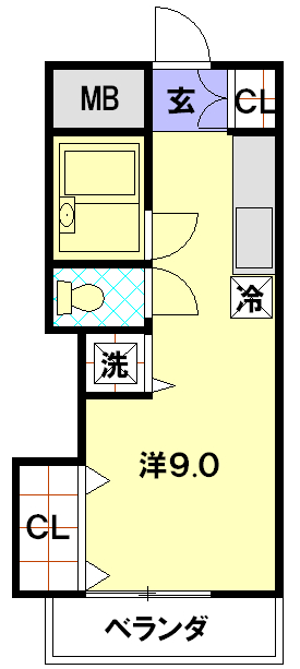 お部屋はワンルームですがキッチンとお部屋の間につっぱり棒をしてカーテンをすれば1Kのように使うこともできます。