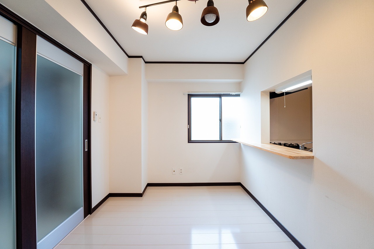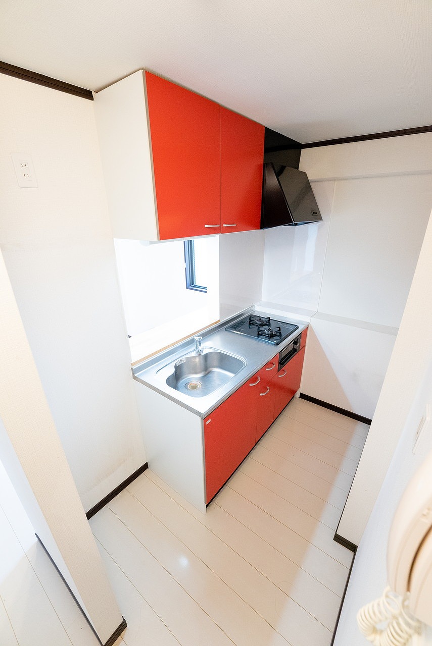 白を基調とした内装に、赤色のキッチンがよく映えます!